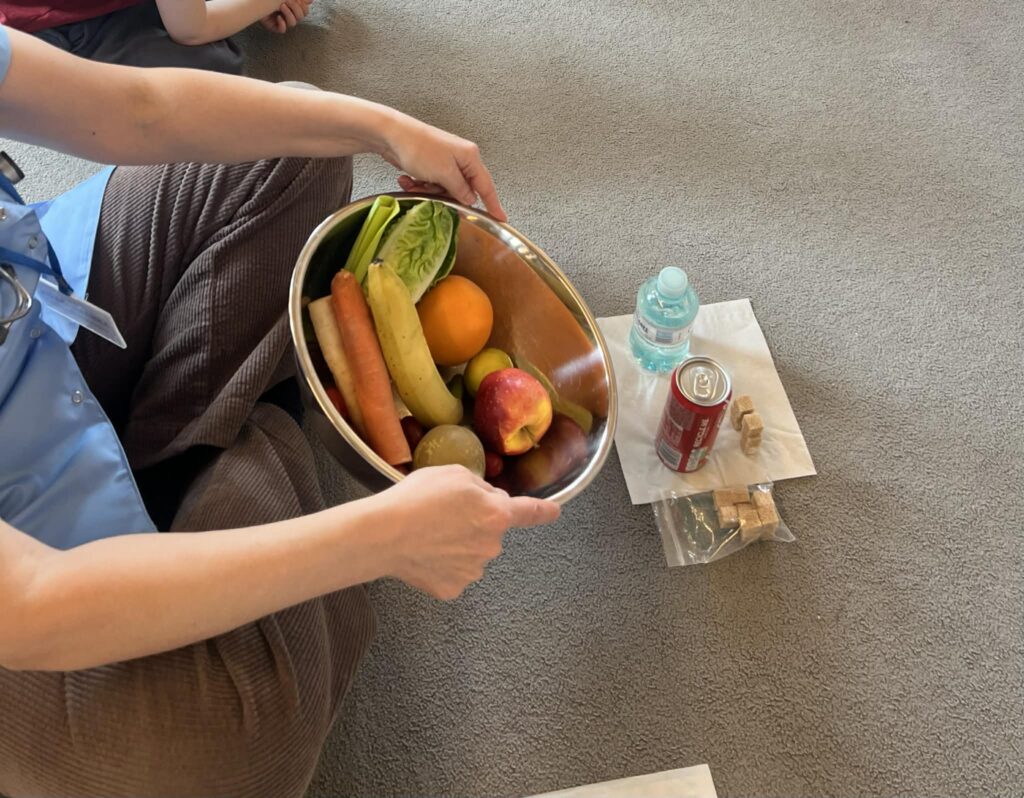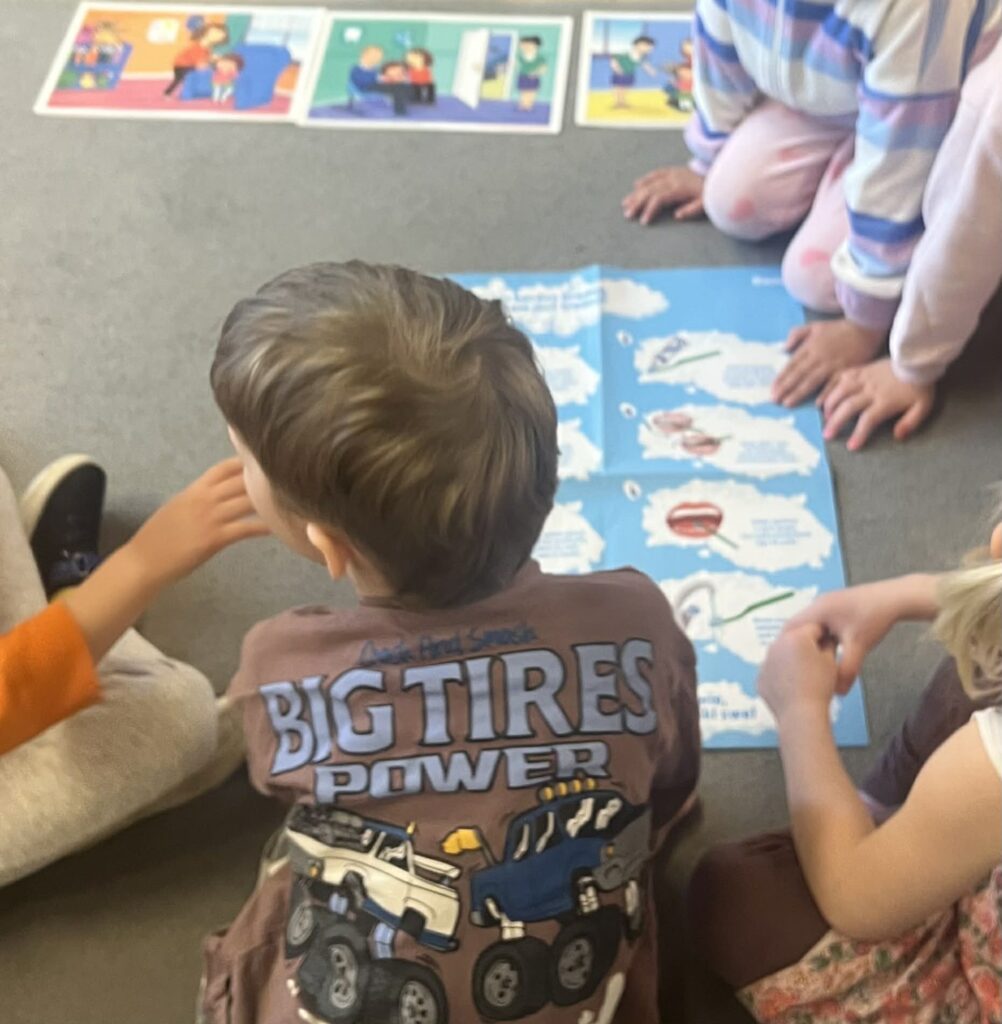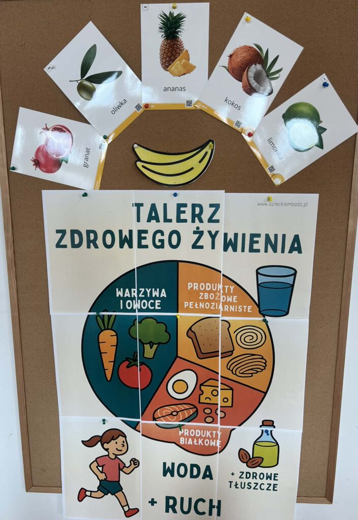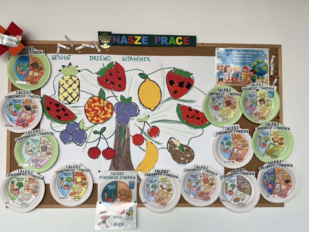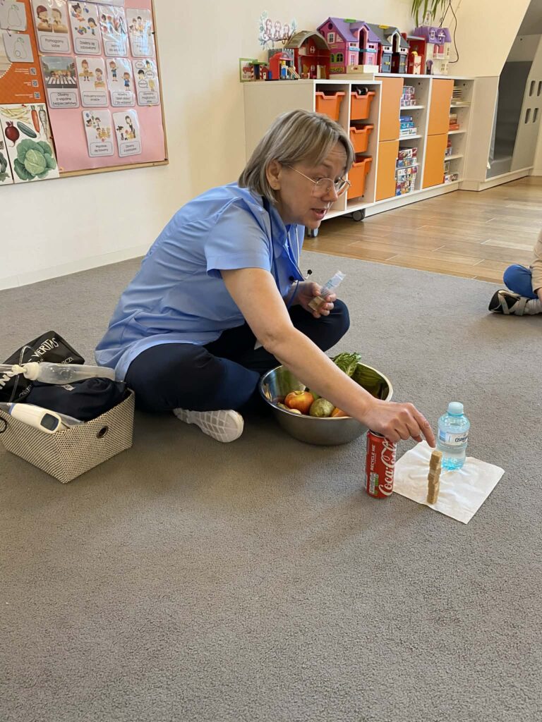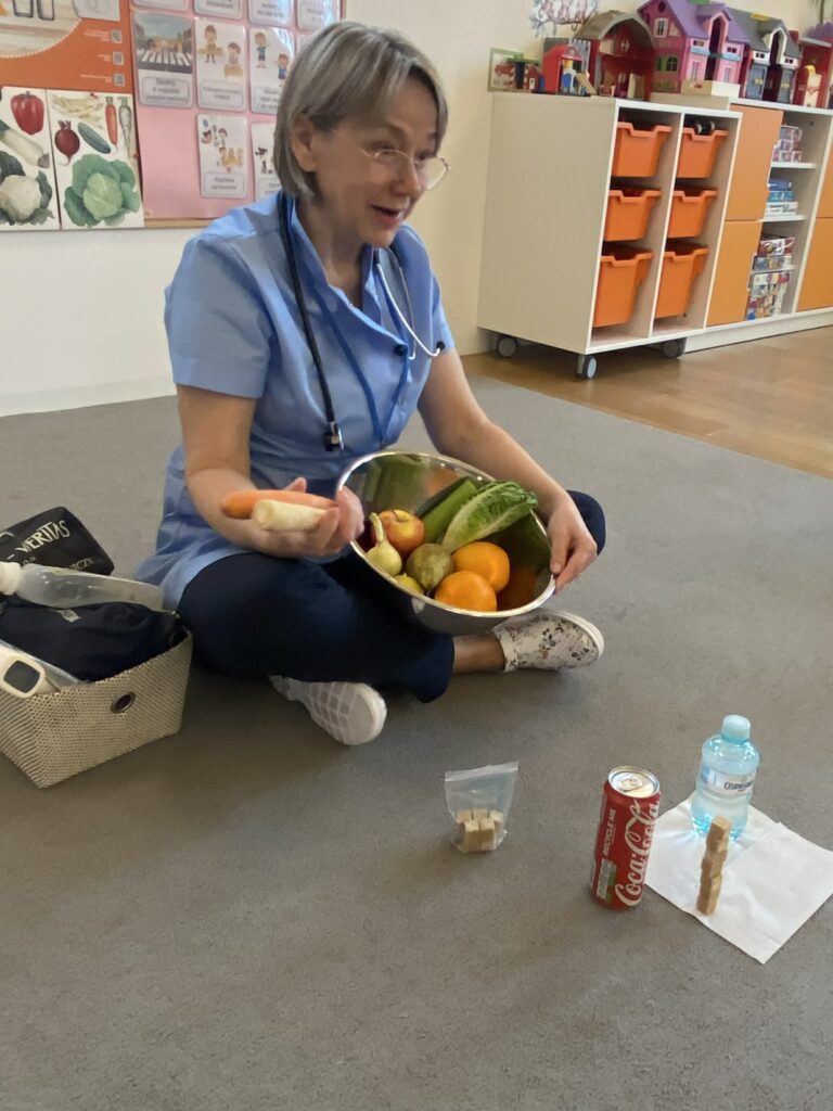 Podczas wizyty dzieci dowiedziały się, jak dbać o siebie, aby mieć siłę do zabawy i nauki. Pani Pielęgniarka w przystępny sposób opowiedziała o zasadach zdrowego odżywiania, wyjaśniając, dlaczego owoce i warzywa to „supermoce” dla naszego organizmu, a picie wody jest lepsze niż słodkie napoje.